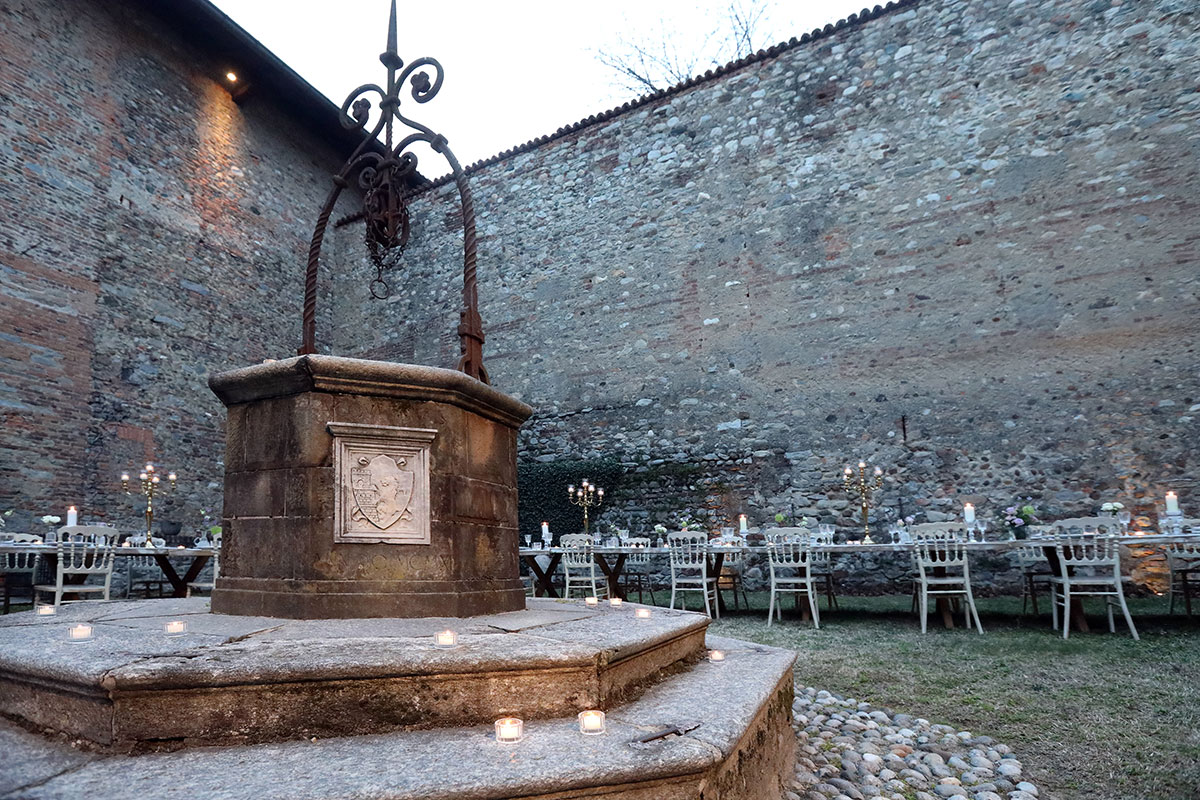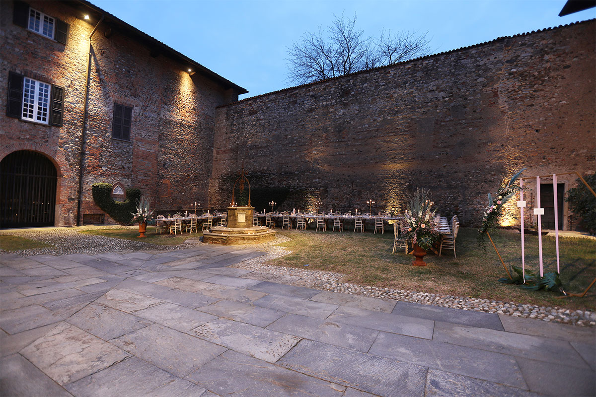 For castle weddings—symbolic or civil—the courtyard can be arranged as the ceremony location, with seating, a flower arch, and a central aisle, offering a suggestive alternative to the indoor halls or garden. But the courtyard is not only for weddings: it is also ideal for photo shoots, corporate dinners, product presentations, or small cultural performances. Every event finds in the courtyard of the Castle of Jerago an environment rich in possibilities, where elegance and history meet with style.