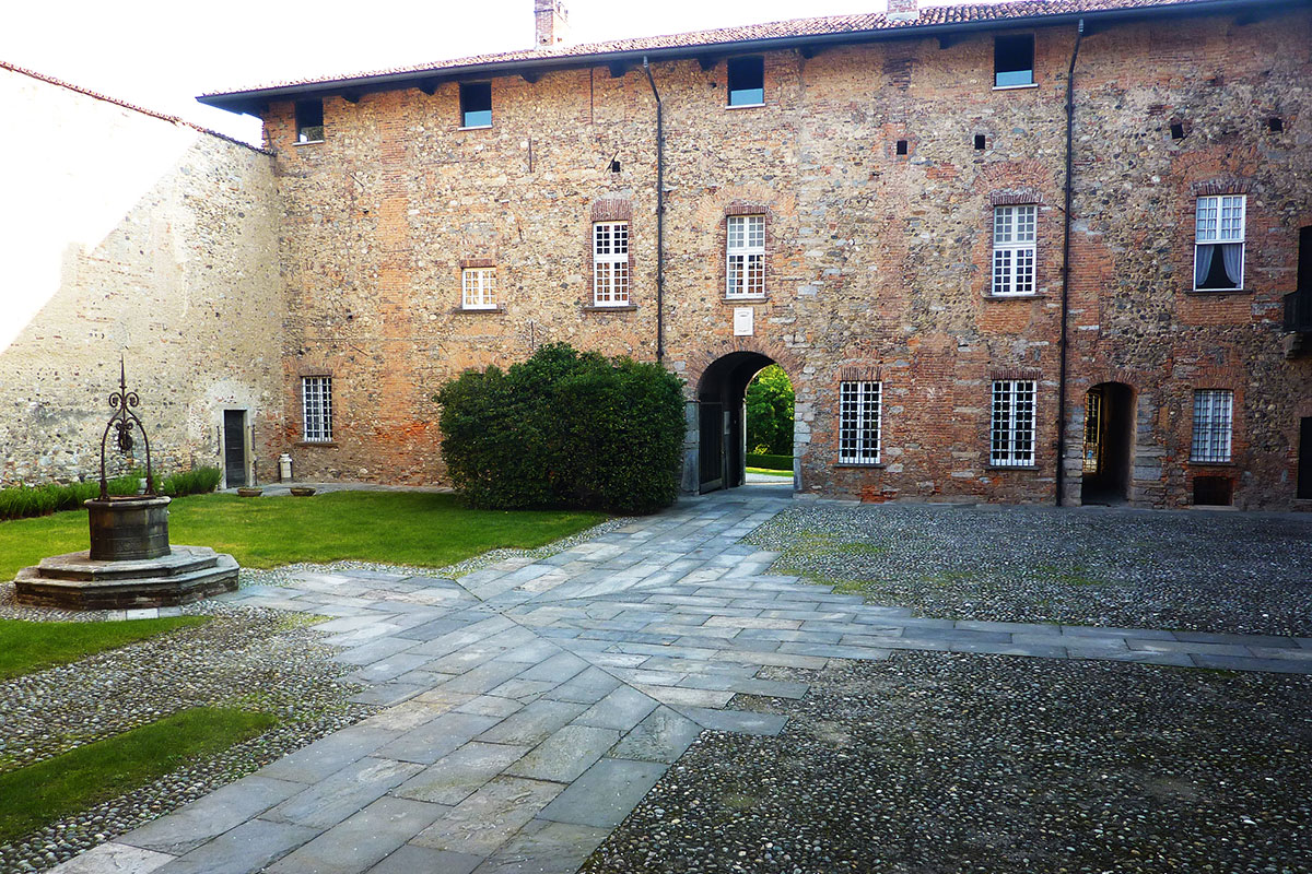 The inner courtyard, the heart of the castle, partly paved with cobblestones and along one side with a grassy area, is surrounded by the characteristic medieval red brick walls, on which, on two sides, are respectively the Belgiojoso coat of arms and the Visconti coat of arms.